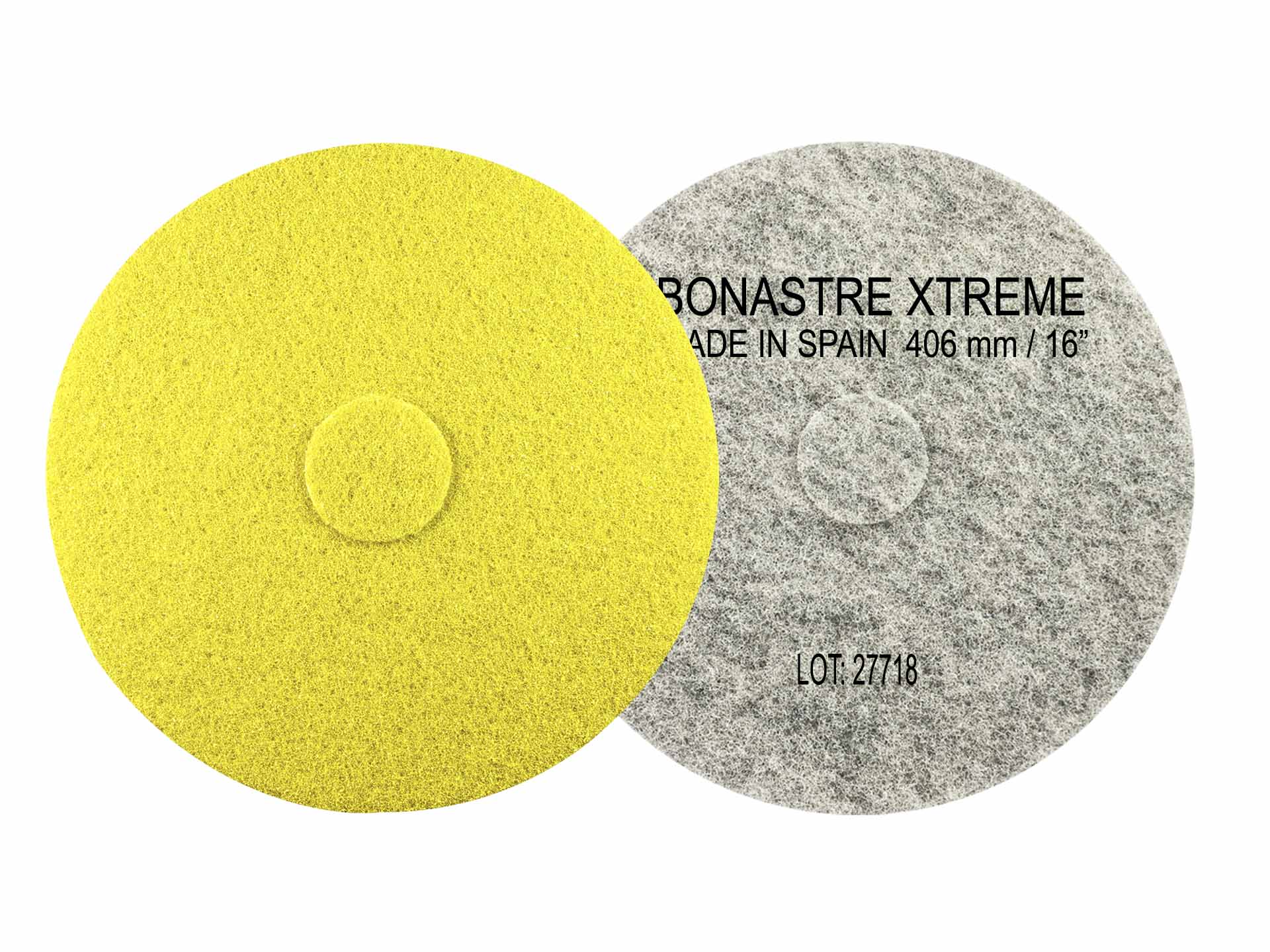 Transform your porous floors with Bonastre’s Xtreme line of pads, specially designed to renew, polish, and maintain surfaces like concrete and hydraulic tiles. Crafted with a resilient natural fiber formula, these pads are perfect for tackling extremely rough surfaces such as concrete, terrazzo, and worn calcium-based stones. The natural pad backing ensures high resistance, outperforming traditional pads and providing more square footage per pad.